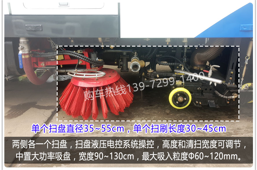 二、上裝配置: 1、帶2個(gè)中置掃盤;中置超寬吸嘴;雙層吸塵筒;康明斯170馬力副發(fā)動(dòng)機(jī),3800軸距多利卡配江鈴64kW增壓副發(fā)動(dòng)機(jī);臺(tái)灣液壓閥;大力馬達(dá);德國高壓水泵(前沖/側(cè)噴/中噴/后噴霧)/側(cè)沖洗水槍/垃圾箱自潔裝置);萬向高壓路沿清洗;威龍低壓泵(前沖),氣動(dòng)球閥控制;4mm不銹鋼垃圾箱;不銹鋼水箱;德國控制器;尾部箭頭燈;機(jī)油、垃圾箱、水箱均帶防溢或低位報(bào)警裝置;倒車及洗掃狀態(tài)室內(nèi)監(jiān)視器;多種語音提示;倒車自動(dòng)保護(hù)、防傾倒垃圾翻車保護(hù)、檢修安全保護(hù);20m高壓沖洗卷盤;刷臂轉(zhuǎn)動(dòng)機(jī)構(gòu)使用德國進(jìn)口高新耐磨工程隔套